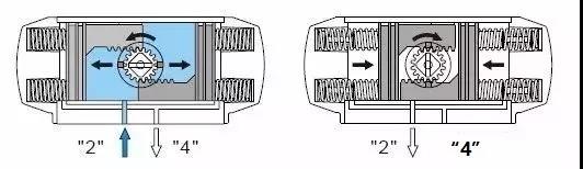 當氣源壓力從氣口(2)進入氣缸兩活塞之間中腔時,使兩活塞分離向氣缸兩端方向移動,迫使兩端的彈簧壓縮,兩端氣腔的空氣通過氣口(4)排出,同時使兩活塞齒條同步帶動輸出軸(齒輪)逆時針方向旋轉。在氣源壓力經過電磁閥換向后,氣缸的兩活塞在彈簧的彈力下向中間方向移動,中間氣腔的空氣從氣口(2)排出,同時使兩活塞齒條同步帶動輸出軸(齒輪)順時針方向旋轉。(如果把活塞相對反方向安裝,彈簧復位時輸出軸即變為反向旋轉)。