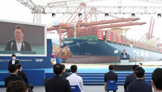 文在寅在當天的講話中誓言,要帶領韓國實現跨越,成為全球海運行業的領導者。“我們將面臨更大的挑戰,通過集裝箱船舶的建造、加速向環保型船舶和港口的過渡以及航運業的數字化,將創造航運業增長的機會。”文在寅說。