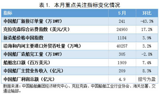 從重點監測指標看,2021年5月,中國造船業景氣先行指數主要分項指標有所分化。其中,中國船廠承接新船訂單241萬載重噸,環比減少43.3%;克拉克森海運指數平均值24960美元/天,環比上升17.2%;新造船價格中國指數1184點,環比上升3.9%;沿海和內河主要港口外貿吞吐量40257萬噸,環比上升3.2%。中國造船業景氣同步指數重點分項指標總體向好。其中,中國造船完工量305萬載重噸,環比下降2.8%;船舶出口額1909億美元,環比增加7.4%;中國船廠主營業務收入209億元,環比增加8.3%;中國船廠利潤總額4.9億元,環比扭虧為盈。