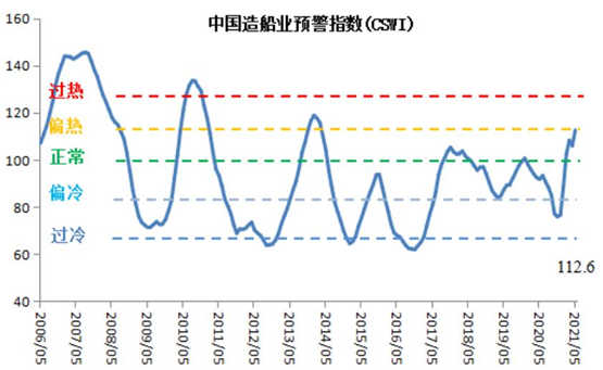 在上述指標綜合影響下,2021年5月中國造船業景氣先行指數為102.65點,環比下降0.05點;中國造船業景氣同步指數為97.3點,環比上升0.5點;中國造船業預警指數為112.6點,環比上升6.6點。從經營情況來看,中國船廠營收、利潤得到較大回升。綜上所述,中國造船業預警指數將位于“正常”區間。