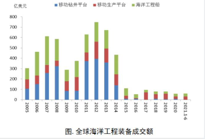 2021年上半年,全球海洋工程裝備新建市場走勢分化明顯,全球累計成交各類海工裝備42艘/座、59.6億美元,以金額計同比上升67.8%。裝備建造訂單總成交金額已超過2020年全年水平,鉆井平臺與油氣用途海工船建造市場依舊冷淡,移動生產平臺與海上風電安裝運維裝備成為低迷市場中的主要支撐。生產平臺訂單共成交12艘/座、31億美元,占上半年全球總成交金額的52%。海上風電裝備新建訂單共成交12艘,17.44億美元,占海工船成交額61.2%,占海工裝備總成交額29.3%。