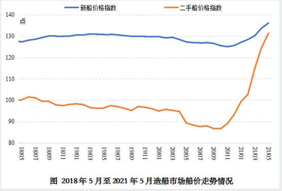 2021年初以來,在航運市場上升需求拉動與用鋼成本上升推動下,全球造船市場新船價格開始上揚。數(shù)據(jù)顯示,截止2021年5月28日,衡量全球造船市場新船價格總體的克拉克森新船價格指數(shù)收于136點,較年初的126點上漲7.9%。分項指數(shù)來看,克拉克森散貨船、油船和集裝箱船新船價格指數(shù)分別上漲14.8%、8.0%和16.2%。